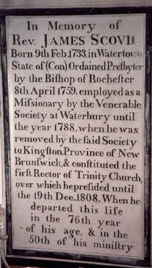 James Scovil's early years were spent in rural employment, as his father had not intended to give him a profession. In his seventeenth year, while employed as a weaver, he met with an accident which changed his life. He was severely lamed, and his father placed him with an eminent surgeon who lived in a nearby town. There he became the pupil of Mr. Southmayd, minister of the Parish. This gentleman found him such an apt scholar that he recommended a liberal education, which was approved by James' father. When fully recovered, James returned home where he pursued his studies with such vigour that in three years time he entered Yale College, graduating with his Bachelor of Arts degree in 1757. He followed that by going to King's College (Columbia), New York, to study for his Master's Degree. Two years before graduation, his father died, leaving him 200 pounds to complete his education. Rather than continuing on at King's College, James went to England where he became an ordained minister of the Society for the Propagation of the Gospel (the Society which supplied ordained Church of England ministers in America). Rev. James Scovil returned to Waterbury, Connecticut in 1759, and took up his duties as Parish Rector - receiving from the S.P.G. 30 pounds annually. At some later time - probably in the early 1760's - James Scovil married Miss Amy Nichols. Following the outbreak of the American Revolution, his sympathies were with England, but he continued to minister to his parishioners with good sense and prudence. Sometime in 1785-86 Rev. Scovil received an offer from the S.P.G. to move to New Brunswick and take up work there. Facing some degree of hardship because of his Loyalist stance, he began in May 1786 to spend the summer in New Brunswick, and to officiate in Waterbury through the winter, a pattern which continued for two years. In July 1787 James Scovil made arrangements to move his family to Kingston, New Brunswick, at which time the vestrymen of the Parish voted him the Lot reserved for the parsonage. In June 1788 he arrived in Kingston with his wife and nine children, and immediately began to build the house - which still stands today, a fine old parsonage in continuous use by succeeding rectors. On July 5th. of the previous summer, Messrs. Silas Raymond, Elias Scribner, and John London had agreed to give one acre of the adjoining corners of their lots, on which to build a church. In December 1788, a subscription was signed by 72 parishioners for the amount of 134 pounds, 15 shillings to help meet the cost; and early in 1789 the British Government contributed 500 pounds toward the building. On June 27, 1789 the frame was raised, and on November 5, 1789 Trinity Church was dedicated to the service of Almighty God by the Rev. James Scovil. This, the oldest Anglican Church in the province, was the keystone of the Church of England in New Brunswick; it was commemorated as a National Historic Site in 1980. In 1802, fifty-five residents of Kings County, headed by Rev. James Scovil, petitioned